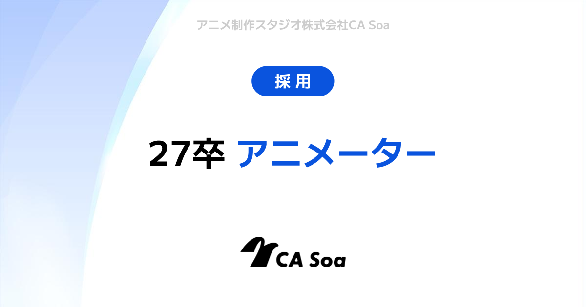 2027年4月入社者対象の新卒採用となります。 ▼選考スケジュール エントリー〆切 2026年6月30日(火)23:59 内定時期目安 2026年8月末 最新の採用情報については、公式ホームページにて掲載をしております。 また、サイバーエージェントグループ アニメ制作スタジオ マイページにご登録いただくと、 会社説明会・スタジオツアーなどの採用イベントや選考会のご案内をメールにてご連絡いたします。 ぜひご登録をお願いいたします。 https://casoa-recruit.snar.jp/entry.aspx?entryid=483f4b64-e26c-4fbe-89c6-63a132e14842
